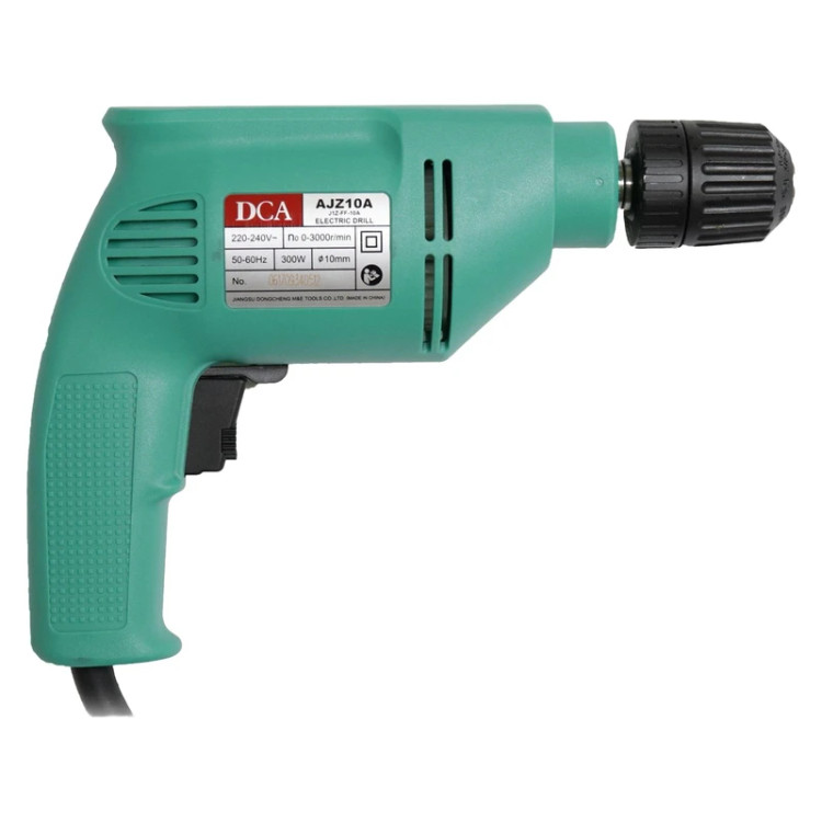 دریل برقی وسیلهای است که با حرکت دورانی سریع، برای سوراخکردن چوب، فلزات، بتن و... استفاده میشود. این حرکت دورانی توسط موتور دریل صورت میگیرد و مقدار قدرت و سرعت حرکت دورانی در دریلها متفاوت است. همچنین با استفاده از انواع متههای متناسب با قطعهی موردنظر، میتوان عمل سوراخکاری را انجام داد. «دریل برقی دی سی ای مدل AJZ10A» دارای موتور 300 وات است که بهطور عمده، جهت کاربری خانگی و برای سوراخکاری چوب و آهن استفاده میشود. تمامی قسمتهای موتور این دریل از قبیل آرمیچر و بالشتک با استفاده از دستگاههای تماماتوماتیک منطبق با آخرین فناوری روز دنیا تولید شده است تا عمر مفید دستگاه به حداکثر برسد. طراحی ارگونومیک بدنهی این دستگاه عامل خوشدستی آن و درنتیجه راحتی کاربر است. دریل برقی دی سی ای مدل AJZ10A کلید الکترونیکی دیمردار (برای تنظیم مقدار گردش سهنظام) دارد تا بتوان با توجه به نیاز، قدرت چرخش سهنظام را تنظیم کرد. همچنین این دریل دارای دکمهی چپگرد و راستگرد است که برای دریلکاری در حالت چپگرد و راستگرد استفاده میشود. وجود قفلکن کلید نیز از دیگر خصوصیات این دریل جهت راحتی کاربر هنگام استفادهی طولانیمدت و مداوم است. با اعمال عملیات گرمایشی استاندارد و سختکاری روی دندههای این دریل، همواره سعی شده دندهها تقویت شوند و عمر دندهها افزایش یابد